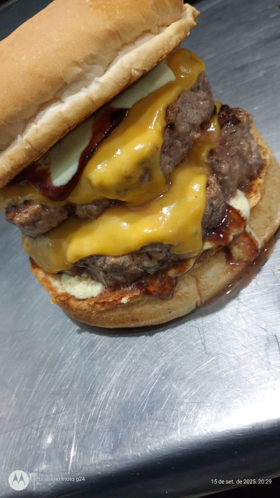 Pão, maionese, barbecue, 2x carne 100g, 2x cheddar ou mussarela, bacon.